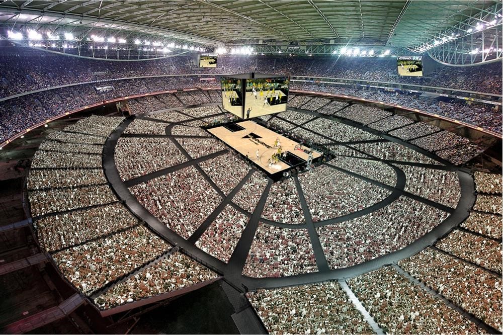 "As this was the first time a basketball game has ever been staged in a football stadium in Australia, we created this background image. Ultimately that mock-up did not reflect the actual seating arrangements."
