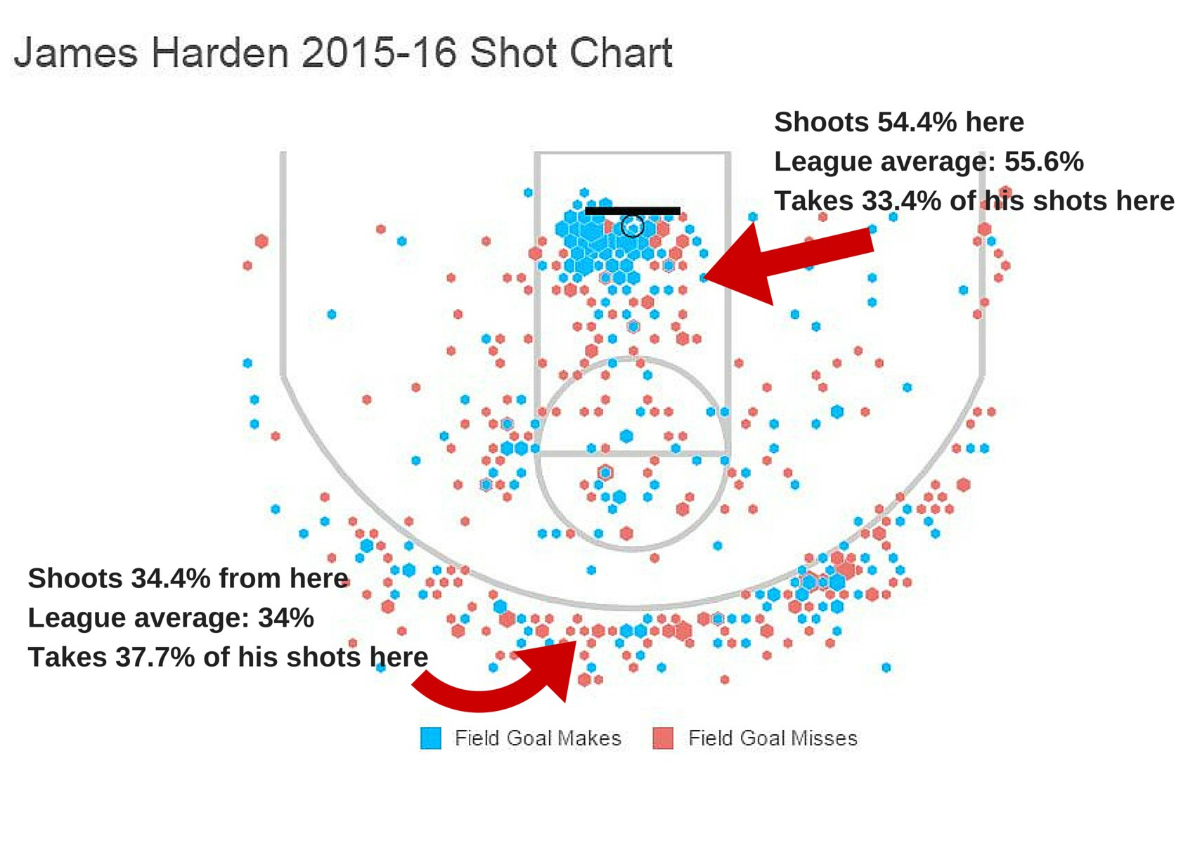 Harden takes 37.7 percent of his shots from above the break, and shoots it at a relatively pedestrian 34.4 percent clip, right about the league average.