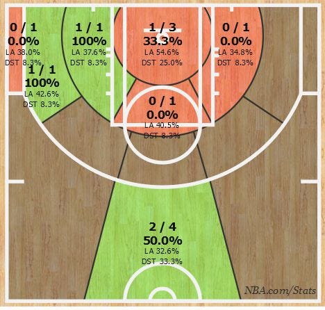 As you can tell, only two floaters actually put points on the board. Delly swished one, and got a goaltending call on another teardrop, courtesy of Bismack Biyombo. The results aren't promising this time. There's probably a reason why floaters aren't used more often. While the floater is often harder to defend or anticipate, the shot mechanics are harder to replicate, compared to a jump shot.