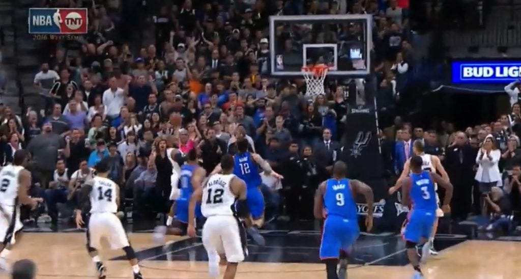 First, he declines the obvious layup, the type of mid-air contortion and finish that Mills has mastered in his time with the Spurs. One could reasonably argue that the angle wasn’t there. Or that the hulking Steven Adams (who actually played like the Hulk in this series) was lurking for the block attempt. And I’d be perfectly fine in accepting those as plausible reasons for, you know, not taking the open shot attempt.