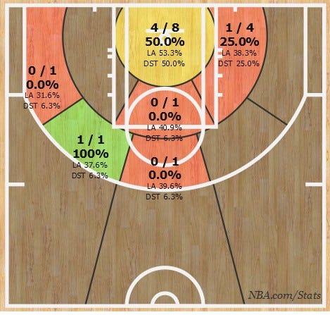 The Big Banger's scoring has dipped after averaging nearly 13 points a game last week as a starting five. He had a poor night against the Jazz, making only a quarter of his shots. In his last three games, Baynes seems to be hanging around the mid-range more when moving off the ball, waiting for the jumper opportunity. Observe his shot distribution (again, only last three games):