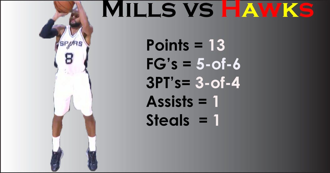 The Atlanta Hawks found this out first-hand when Mills' San Antonio Spurs romped to a 108 – 88 victory and solidified second place in the league standings.