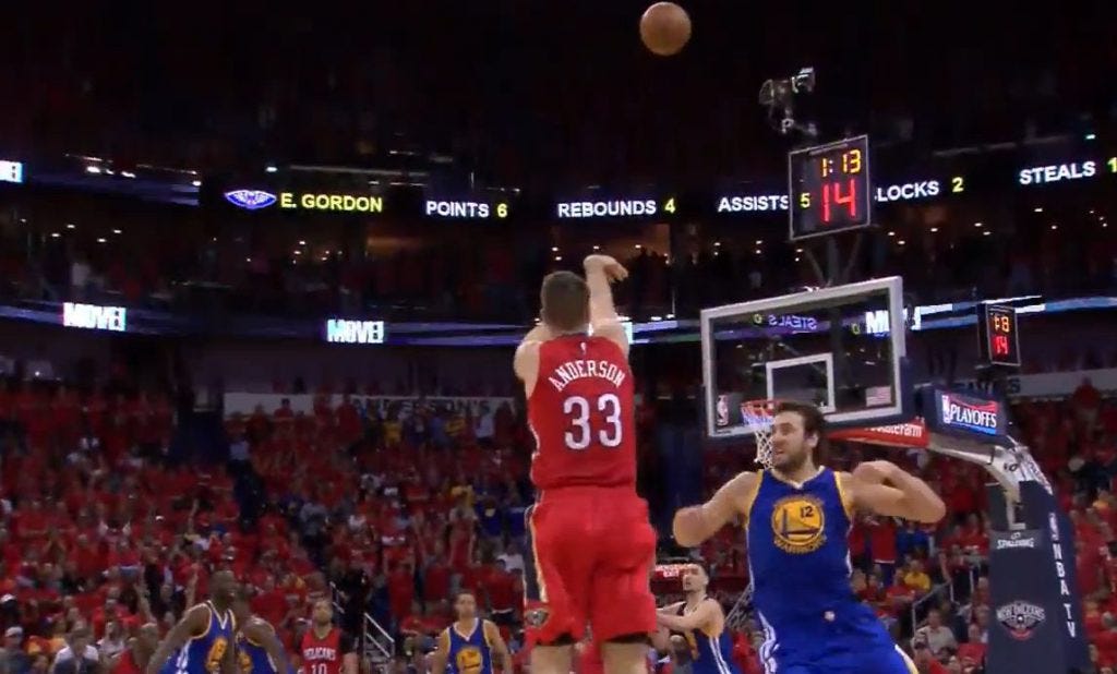 Here's a thought on potential defensive mismatches: Bogut's role as rim protector might spell problems on covering stretch forwards. Instead of Omer Asik, the Pelicans paired Ryan Anderson up with Anthony Davis, opening the floor up with a deadly shooter. The clever timing of this play forced Bogut to rotate and help on the rolling Davis, while Anderson scrambled free for an open shot at the wing.