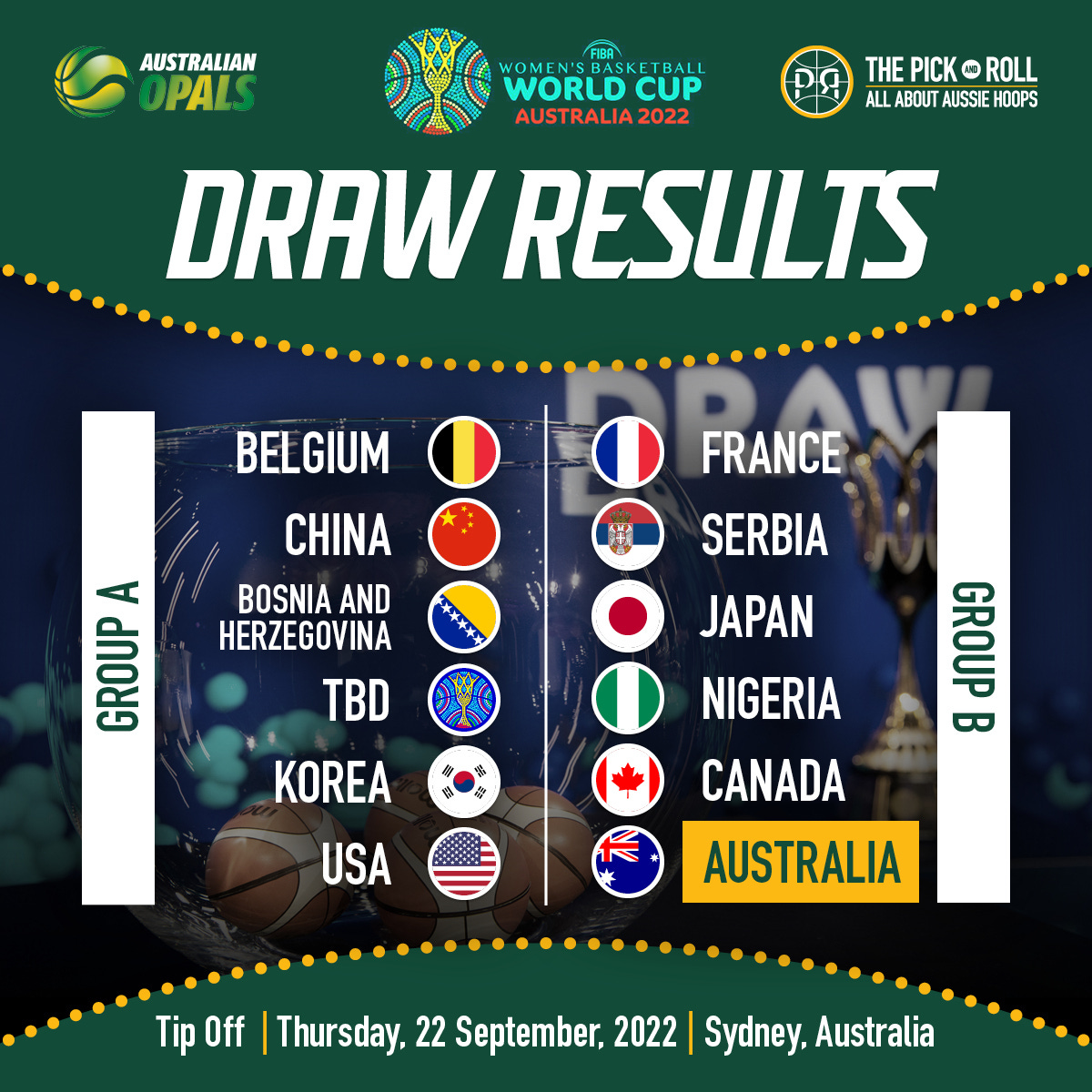 Opals legend Michele Timms had the honour of drawing the teams, leaving Australia with pool opponents of France, Serbia, Japan, Nigeria and Canada in Group B.