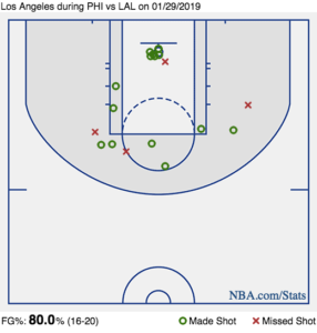 During the 16-0 run, the Sixers were 0-11 from the field. Los Angeles was able to roam away from the ball and disrupt an often-cramped half-court offence. While not a factor in tonight’s result, deploying any five man units featuring Simmons, McConnell and Brewer is something that could sink the Sixers against competent playoff opposition.