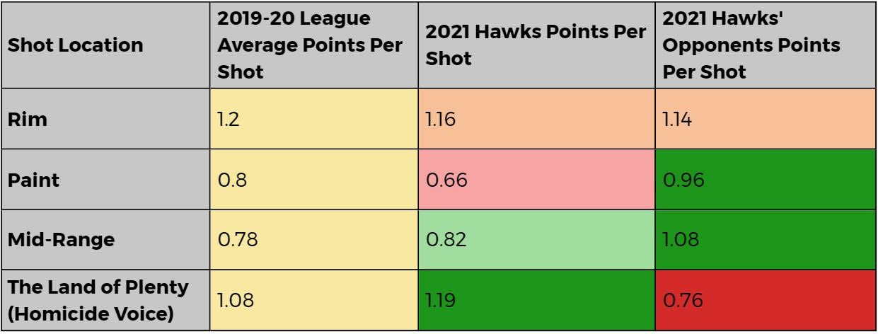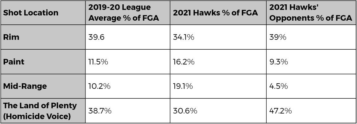 If you’ve ever read the Kirk Goldsberry book Sprawlball, you’ll know why those numbers aren’t good for the Hawks. Modern basketball, at least in large part, is all about location, location, location.
