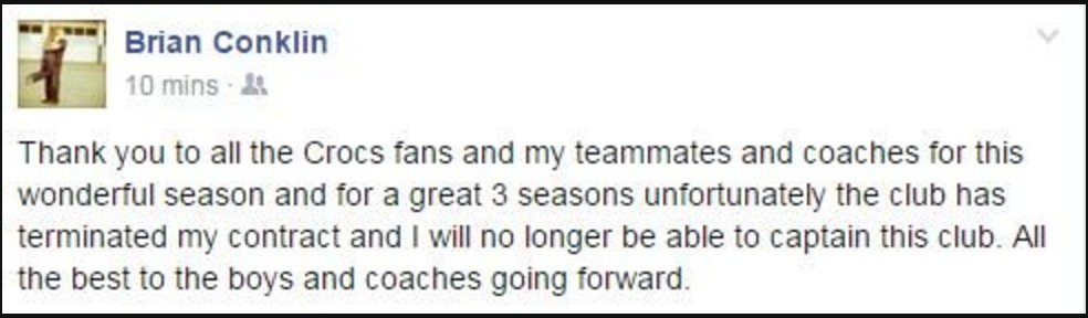 In what is the first time the league's reigning MVP has been sacked from his club the following year, Conklin had nothing but praise for his home over the last three seasons over social media.