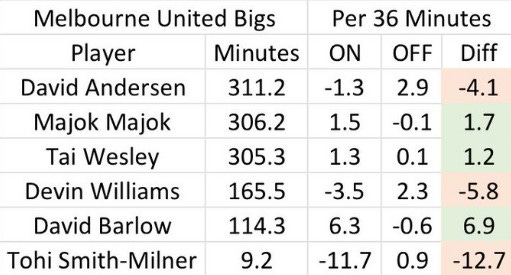 David Barlow was the recipient of the vacant starting spot that Anderson’s absence created against Sydney on the weekend and he produced a tidy stat line in what Melbourne fans can certainly be encouraged by. His presence next to Majok Majok is a vastly different look with his smaller stature allowing Melbourne to put more versatile line-ups on the floor that can play faster, be more interchangeable on both ends, and space the floor even more for Goulding and Ware to work on the ball. Todd Blanchfield’s return also pushes Owen Odigie’s minutes down again in what provides Melbourne with a clear upgrade (United went minus-37 in 187 minutes with Odigie on the floor) and another legitimate option if Dean Demopoulos decides to play small.