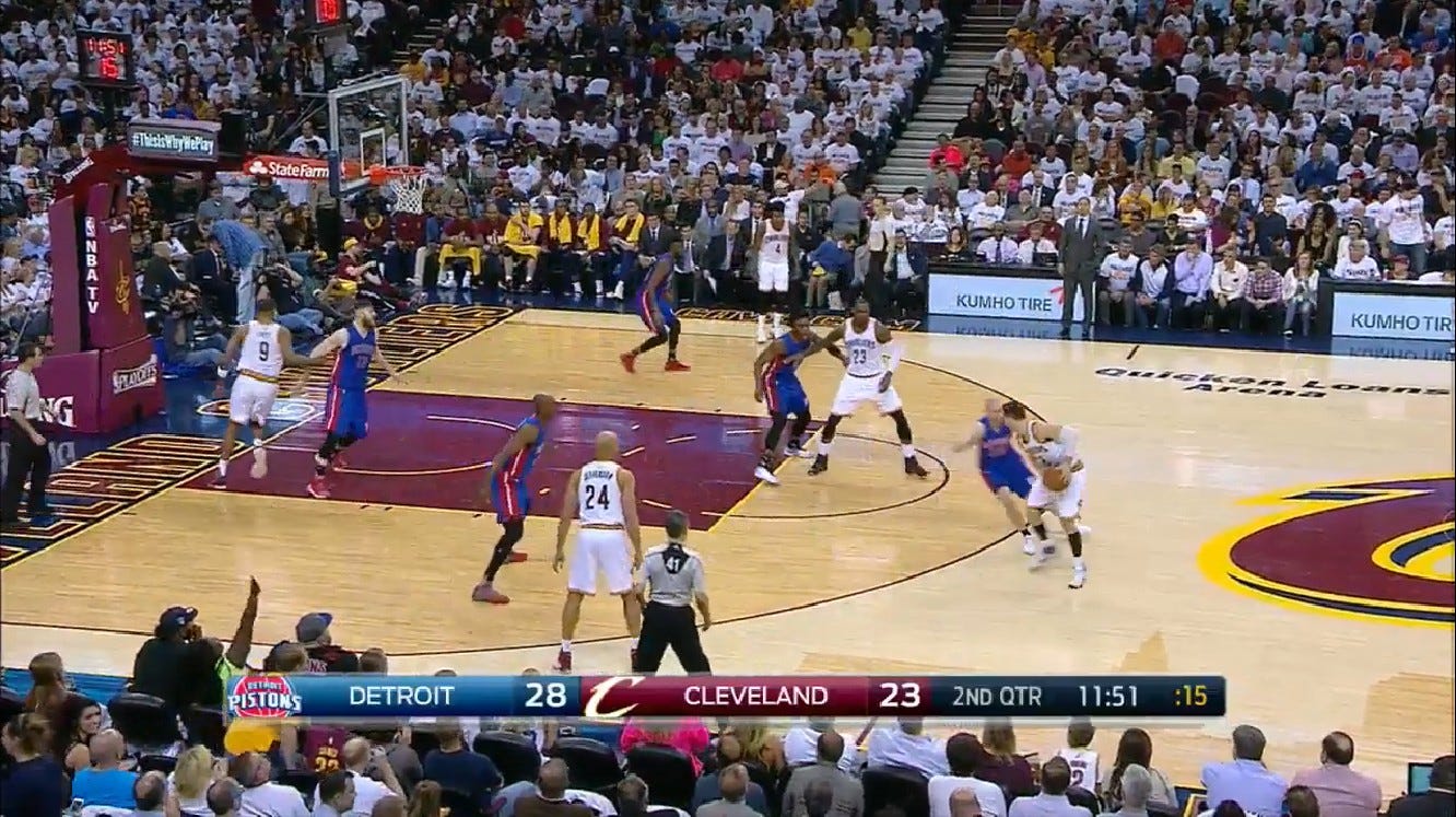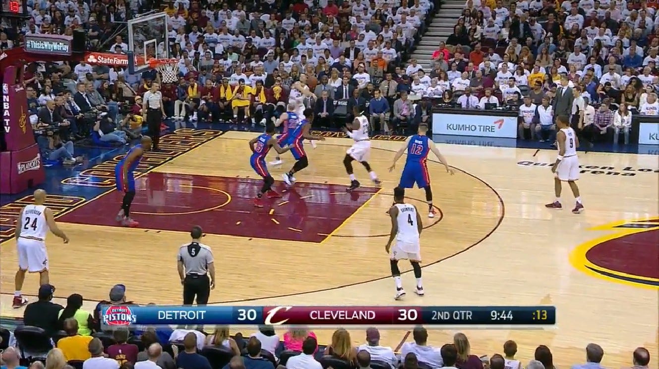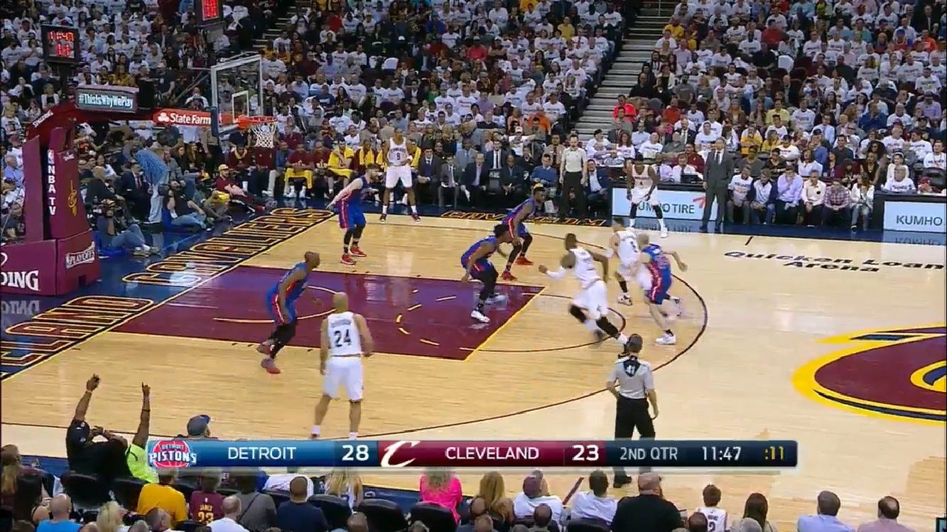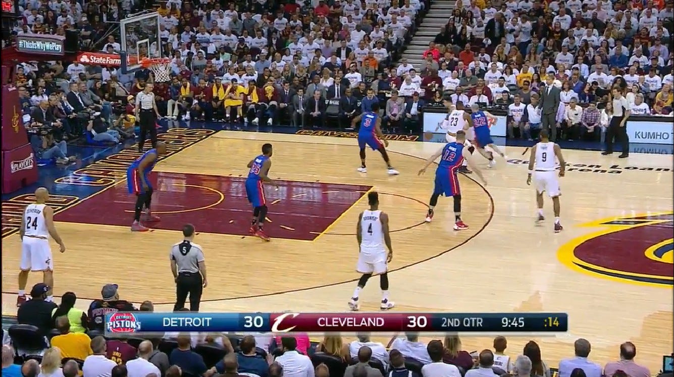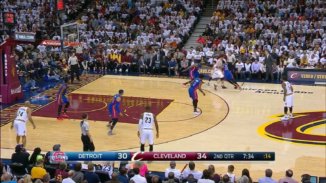 On this play, the Dellavedova-James pick and roll confuses the Pistons defence once again.