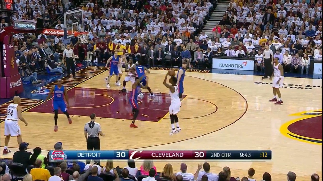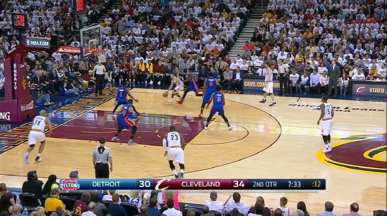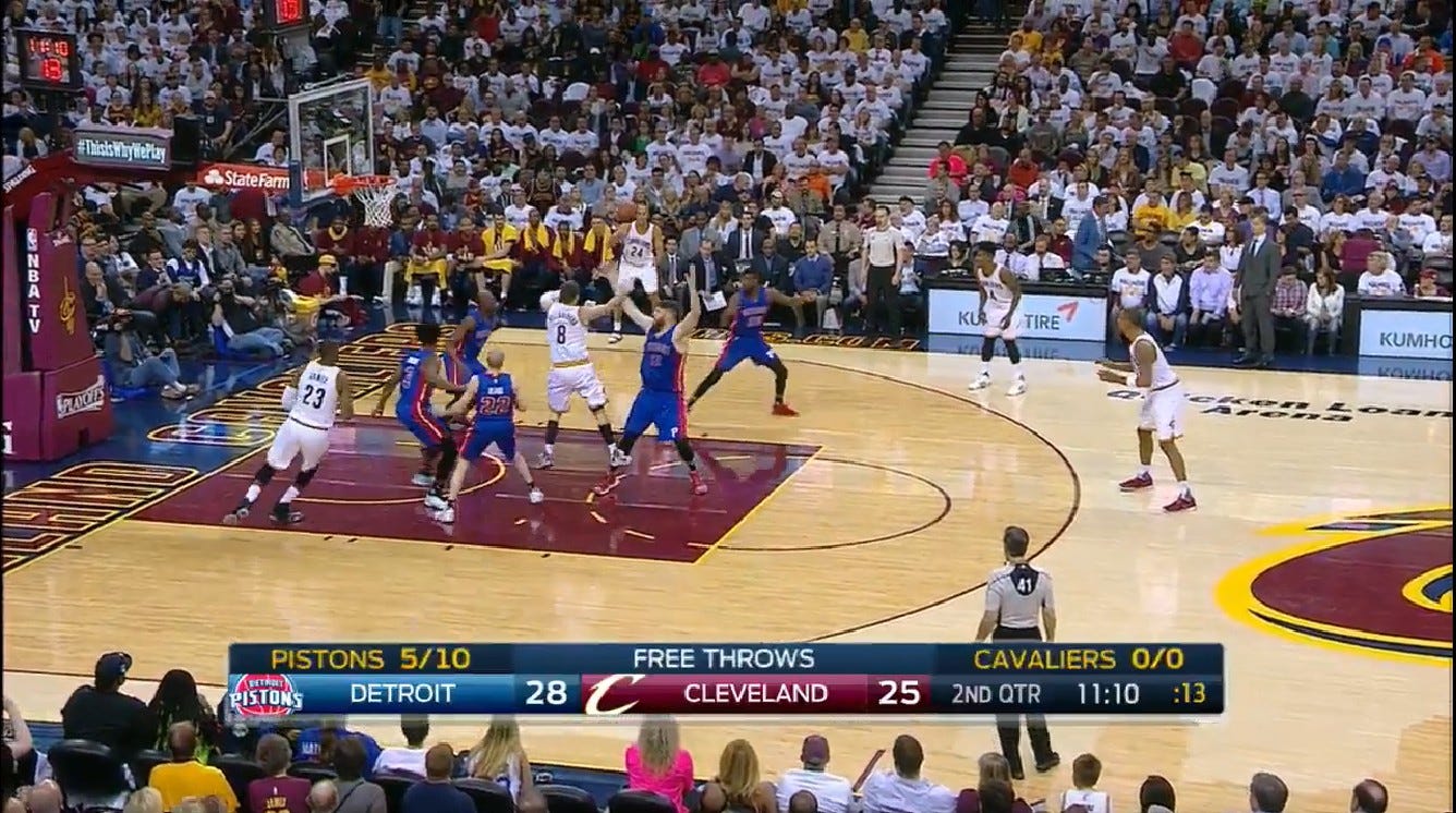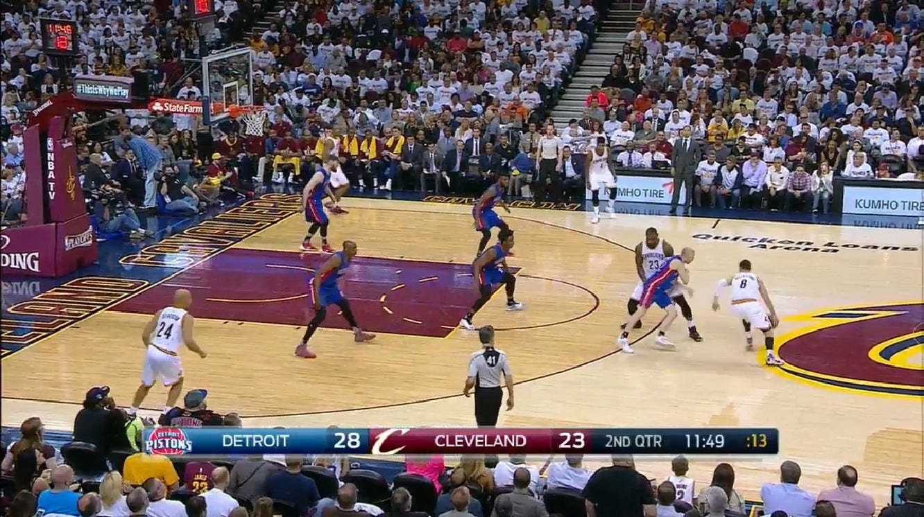 The same five Detroit defenders- Blake, Johnson, Baynes, Bullock and Tolliver- are all looking at the Dellavedova-James action on the strong-side wing. Meanwhile, Frye, Shumpert and Jefferson are all evenly spaced out.