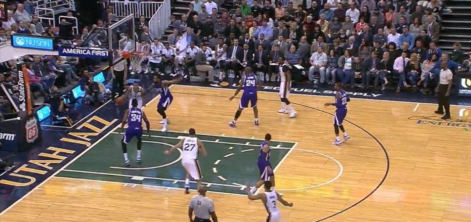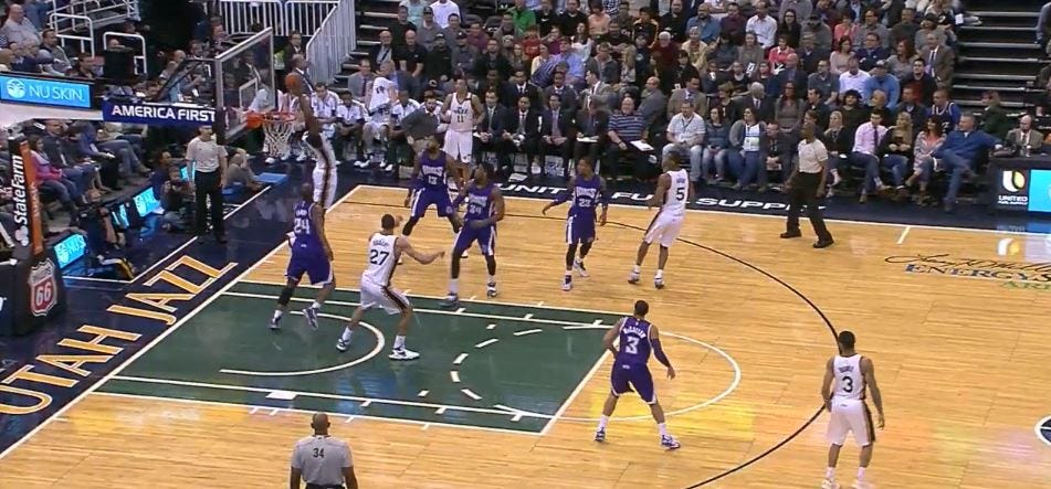 Instead of passing it off or bringing the ball back up, Exum saw the driving lane available, and chose to attack the baseline.