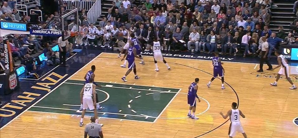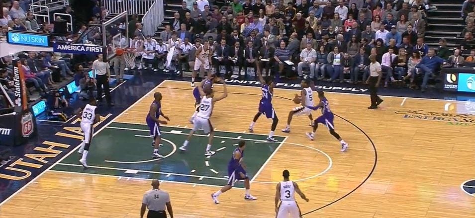 In this possession, Hood curled off baseline and received the ball from Gobert. He faked, and drove right when McLemore was still trapped behind a hulking Mount Gobert screen.