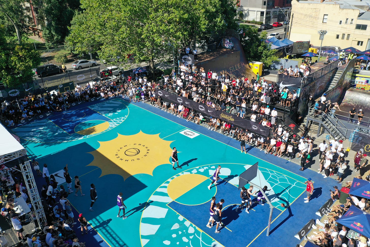 In stark contrast, this year’s event —now backed by sponsors Nike, House of Hoops and Foot Locker— boasted a stage, screens, seating, food vans, artists, and a vibrantly painted court. The dunk contest was judged by an all-star cast including Collingwood Magpie Mason Cox, Olympic medalist Peter Bol, and Melbourne United players Shea Ili and Jo Lual-Acuil. The ultimate winners, Team Prahran, walked away with a cheque for $20,000.***