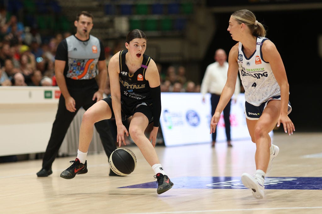 Two minutes later, Melbourne was under siege outside the three-point line with the shotclock winding down. She put her head down and pounded two hard dribbles to her right-hand side, before quickly switching left with a nifty crossover that split Izzy Borlase and Brianna Turner. Threading the needle, she stretched into the paint, converting a tough lefty finish at the rim. Canberra by six.