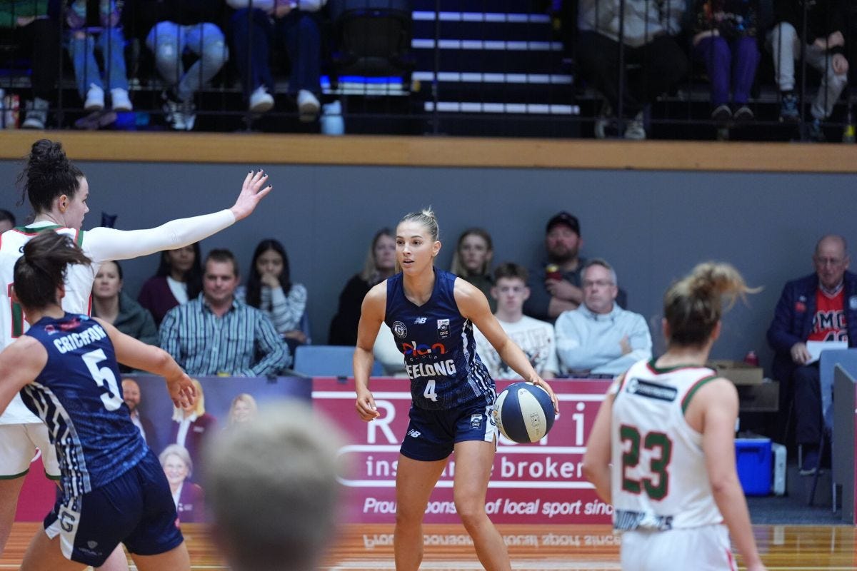With the main event eventually underway, Gemma Potter, one of the competition’s rising stars, holds the ball at the perimeter, orchestrating Geelong’s offence. She waits patiently, as Jaz Shelley darts around a Hannah Hank screen. Shelley is played high, her defender denying a turnout, so she flares to the corner, where Potter’s pinpoint pass lands precisely in her shot pocket. Almost automatically, Shelley drains a corner three. She then pays it forward, finding Taylor Mole for triple - not once, but twice. All net, not once, but twice. The pair have an irresistible chemistry, and even with Geelong taking a two point lead into half time, there’s a sense of inevitability about what’s to come.
