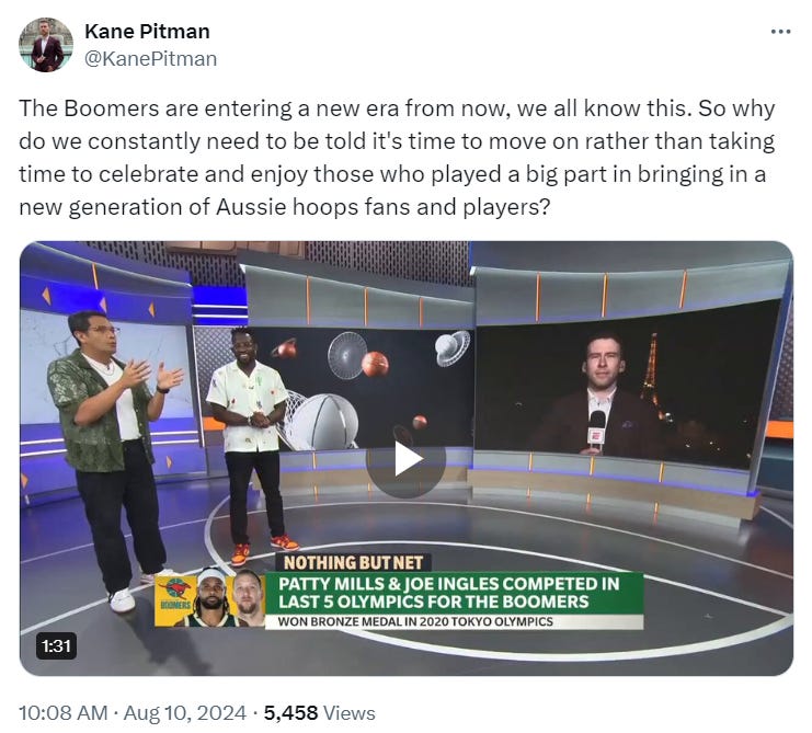 The sudden end to this year’s Olympic run was jarring, but as the dust settled and the disappointment started to fade, the realisation set in that this could be the end of the road. Ingles has already flagged that this was his final Boomers appearance, and while Mills and Dellavedova may push on, they will be 39 and 36 years old respectively when the 2027 World Cup tips off. With the knowledge that Father Time is undefeated, Australians have started to give that trio their flowers.