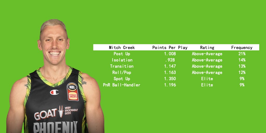 Still, despite a difficult team context to overcome, given South East Melbourne’s injuries and depth issues, Creek averaged an elite 21.1 points per game on efficiency (PPP) that was only bettered by a handful of high-volume players.