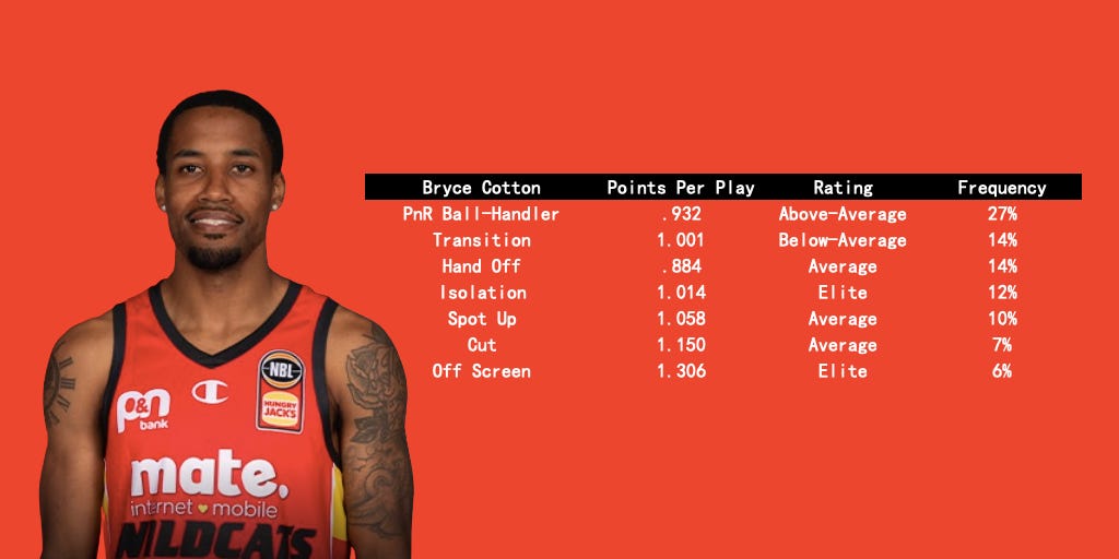 Any questions on his efficiency are quickly squashed when you factor in his league-leading 7.9 free throw attempts, as well as a low turnover rate. His ability to draw fouls and capitalise at the line juices his True Shooting Percentage up to a healthy 57%. Even with the playmaking load he carries for others, and the overall attention he draws, Cotton’s scored a seriously impressive 1.056 points per play this season — a mark that trails only Chris Goulding among guards in contention for this list.