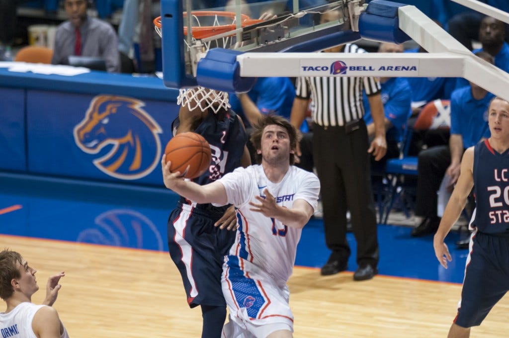Drmic on his way to the basket against UTA - Courtesy Karl LeClair via Boise State Athletics