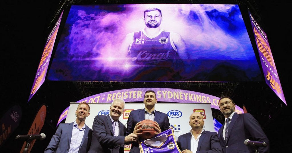 SYDNEY, AUSTRALIA - APRIL 24: L to R , Jeff Van Groningen, Kings Managing Director, Andrew Gaze, Kings Coach, Andrew Bogut, Larry Kestelman, NBL Owner and Jeremy Loeliger, NBL CEO, pose for photographs at a press conference to unveil Andrew Bogut as a Sydney Kings player at Qudos Bank Arena on April 24, 2018 in Sydney, Australia. (Photo by Mark Evans/Getty Images. via NBL/Sydney Kings)
